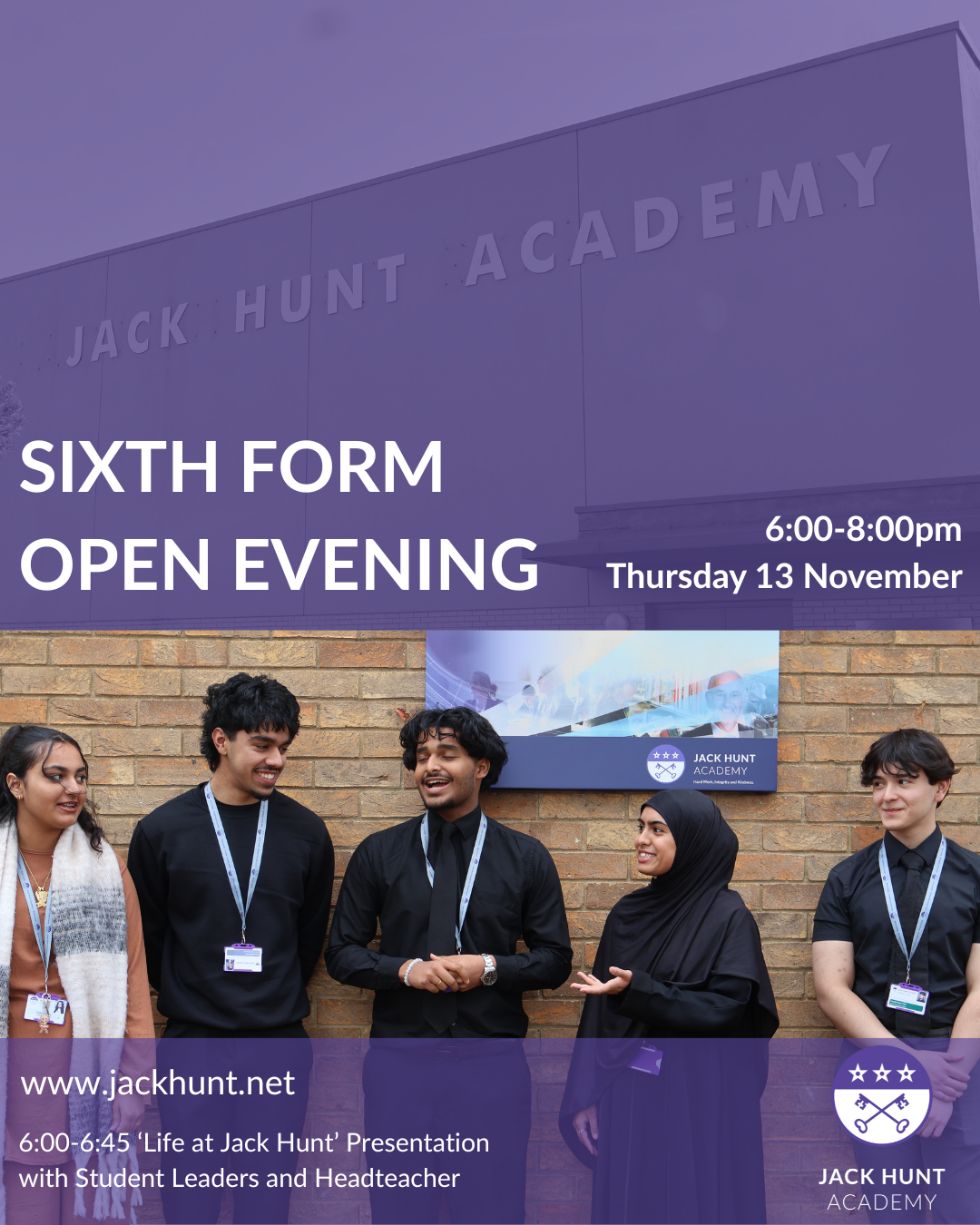 Jack Hunt Academy are holding their annual Sixth Form Open Evening on Thursday 13 November 2025. We would like to extend a warm invitation to you and your child to come along and find out about being a sixth form student at Jack Hunt Academy and the opportunities we offer.