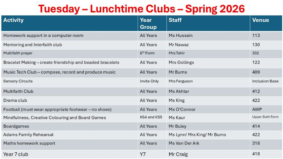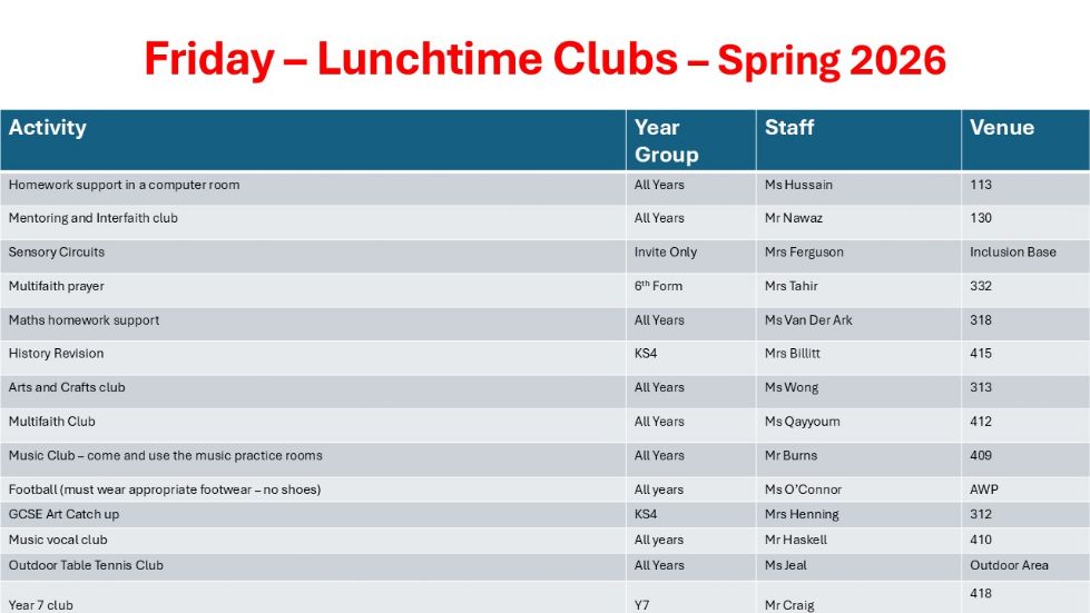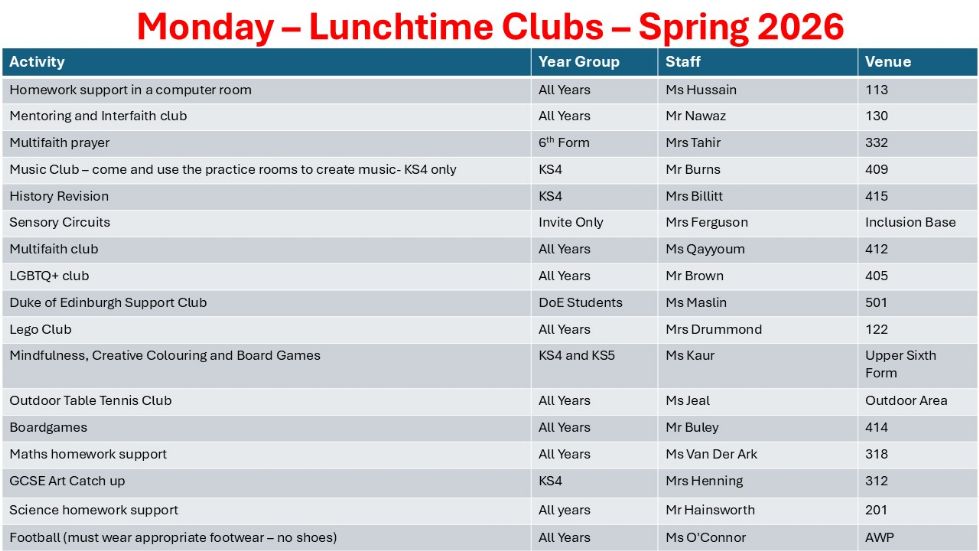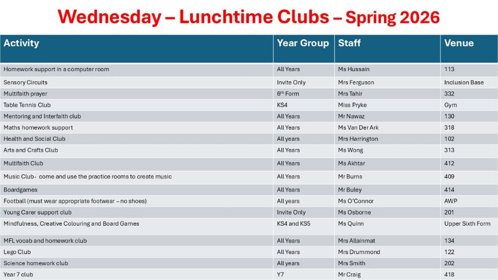 We are also now running a great number of lunchtime clubs for our students. The clubs are a great way for students to meet new people, socialise with friends, learn a new skill, get homework completed in school, develop an existing skill or just have some fun!
