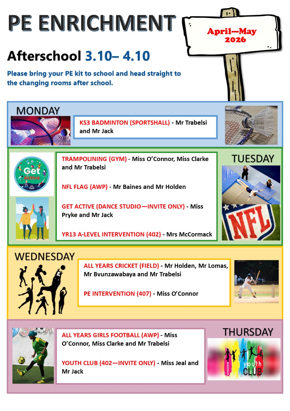 Jack Hunt Academy has a number of after-school PE clubs taking place for students along with a Football Academy on a Tuesday and Netball on a Wednesday.